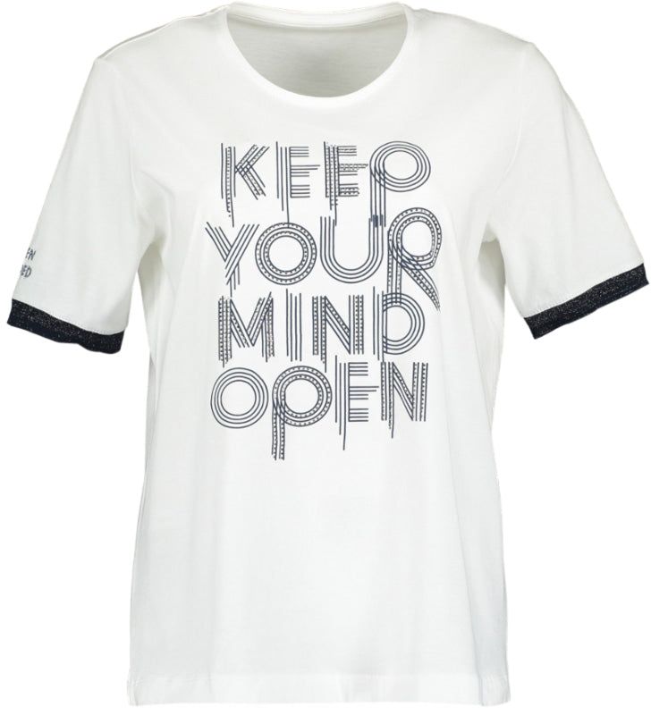T-Shirt in weiß, von Steilmann, mit glitzender Aufschrift: "KEEP YOUR MIND OPEN", und Ärmel mit dunkelblau/glitzerndem Abschluss